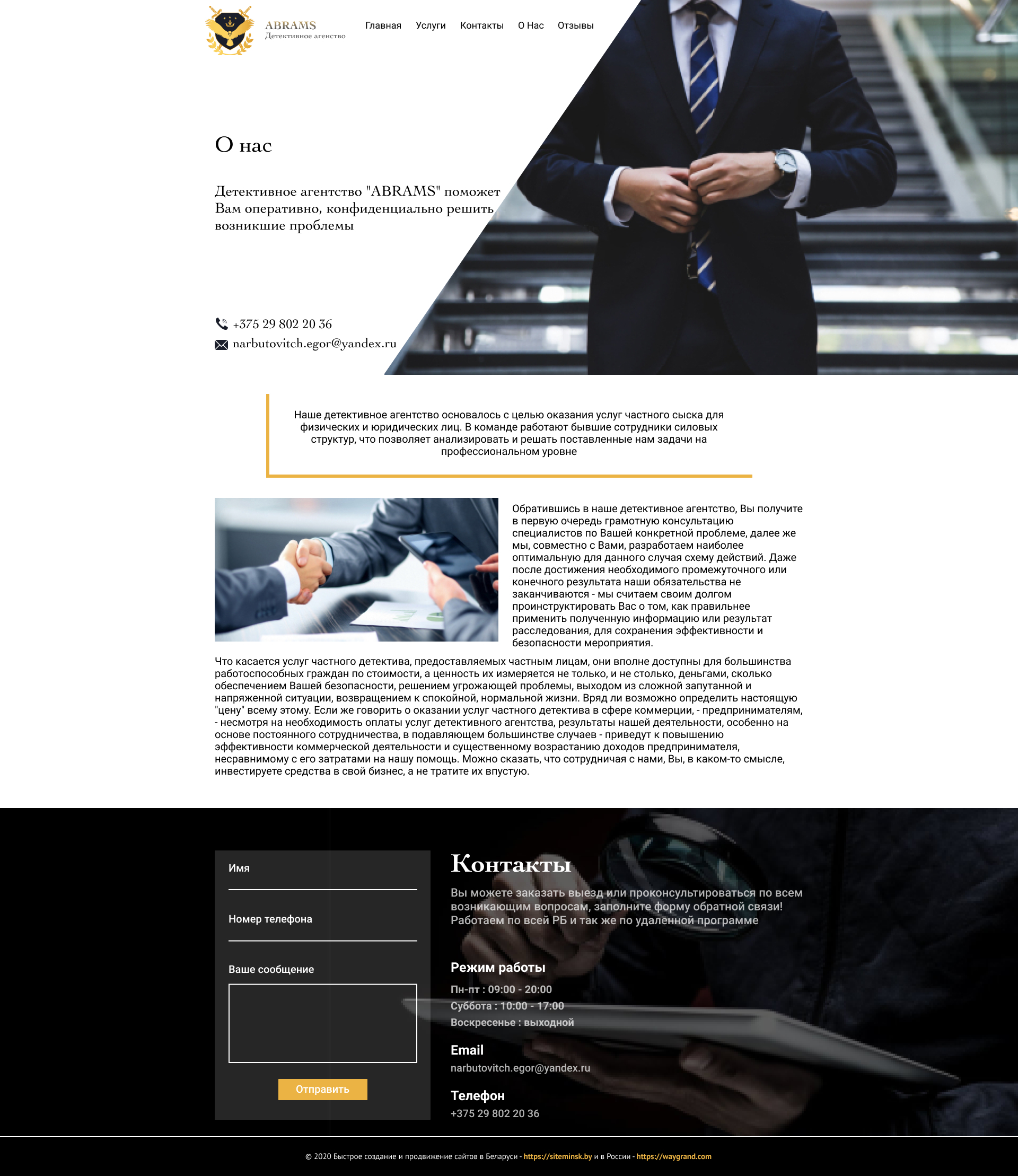 Закажите готовый продающий сайт визитка #239 в Батайске за 5-7 дня «под ключ»: свёрстан, отрисован и готов к рекламе. Тематика шаблона «Частное детективное агентство».